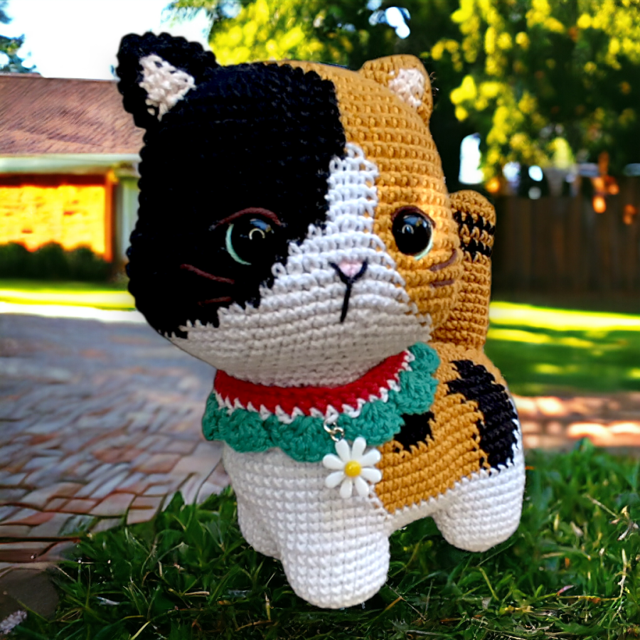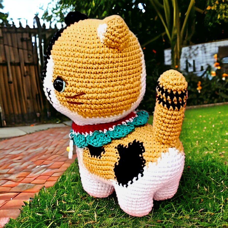 Esta gatita está tejida a crochet con algodón premium 100% hipoalergénico.